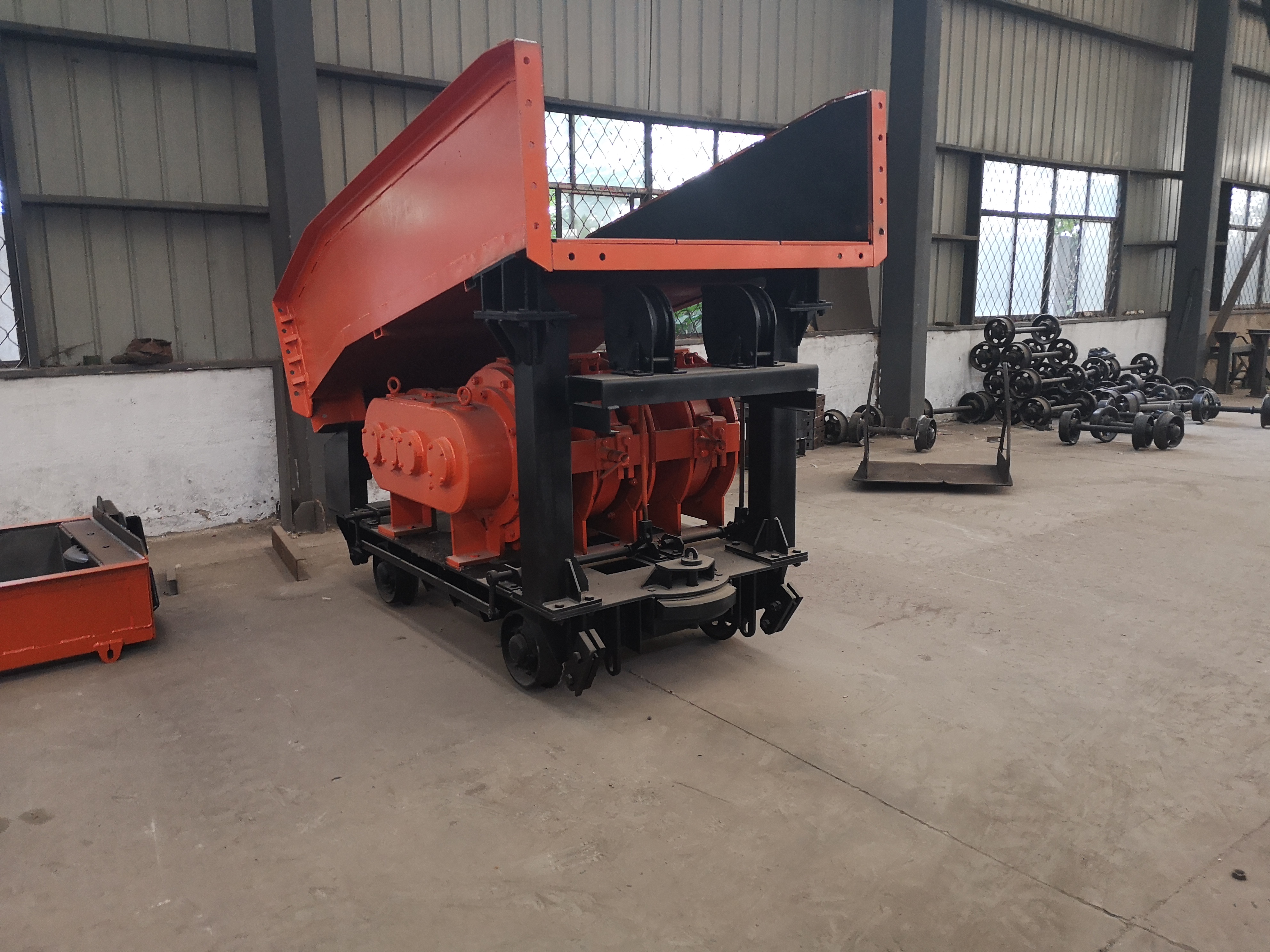 耙斗装岩机主要由固定楔、尾轮、耙斗、操纵机构、台车、绞车、导向轮、进料槽、中间槽、卸载槽、电气部分等组成