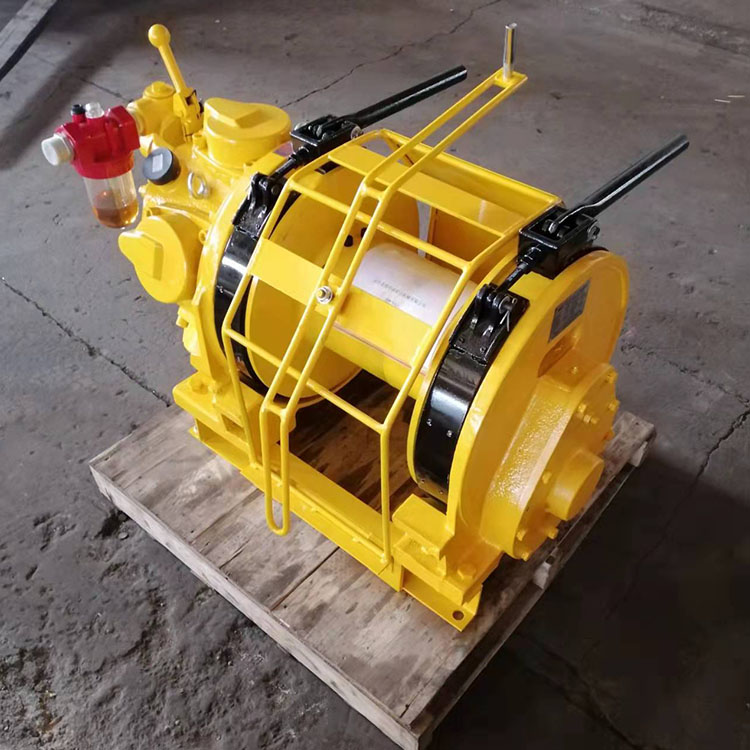JQHS-40×20气动绞车是以气动马达为动力,通过齿轮减速机构驱动卷筒,实现载人提升和重物牵引、运输或托运的绞车装置。它具有结构紧凑、操作方便、工作安全可靠、维修简单、运转平稳、无级变速等优点,适用于油田、地质钻井、矿山开采及易爆、易燃气体等场所。适用于海拔1000米以下,气温-40~60℃的环境。